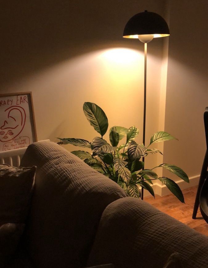 The coffee table is glowing candles flickering, fairy lights lazily tangled, lampshades casting their soft amber haze across the room.